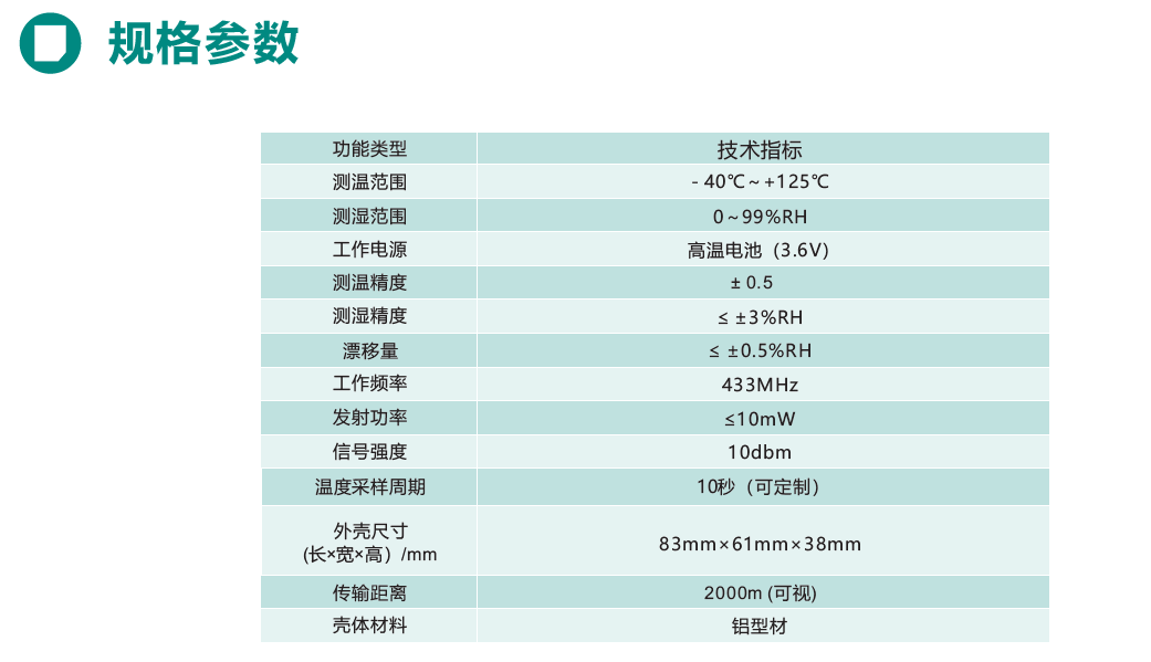 產(chǎn)品采用大容量電池供電方式,集成低功耗、抗干擾、無線加密、傳感技術(shù)于一體。產(chǎn)品結(jié)構(gòu)材料選用熱穩(wěn)定性高的鋁型材,保證了在復(fù)雜環(huán)境下工作的穩(wěn)定性和可靠性。