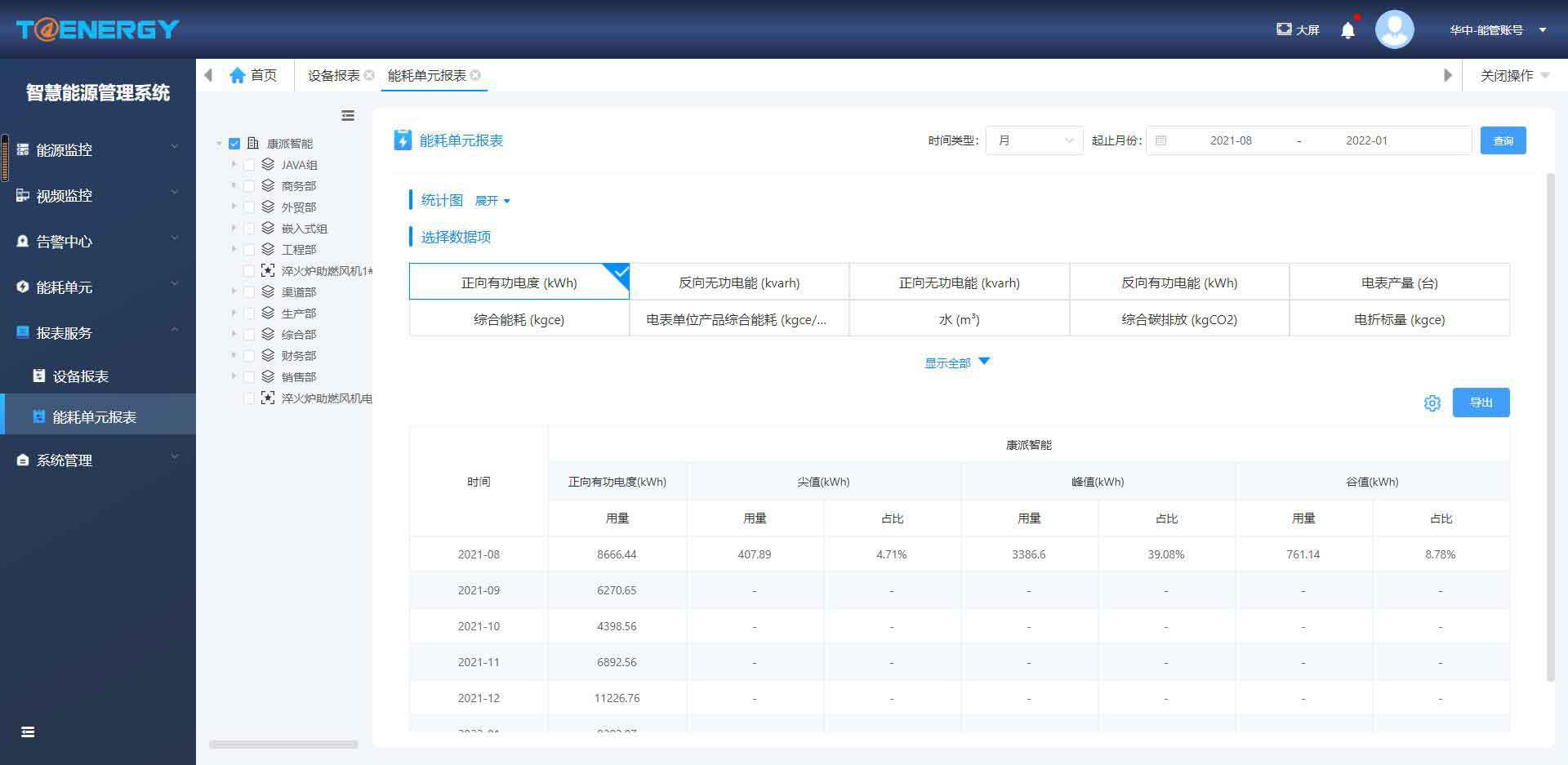 報表包含有日報表、月報表和年報表。通過多樣化的報表服務滿足生產現場的多種多樣需求。報表設有打印功能,可定時自動打印或觸發條件打印,并可導出到excel表格中,顯著減少抄表工作的人力成本,提高用戶的經濟效益。展示單個或者多個能耗單元的多個用量數據項并在特定時間段內計算其相關的數據項實時值。