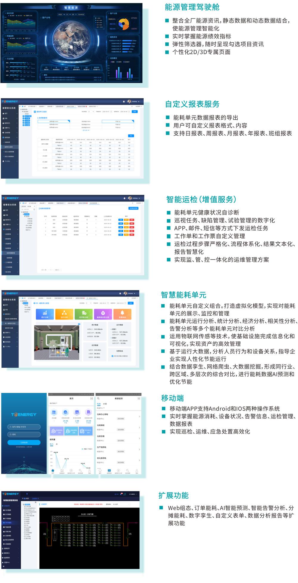 T@Energy智慧能源管理系統對能源使用情況,對設備運行實行集中監測、管理和分散控制。以區域數據為基礎,結合“互聯網+大數據”的有效利用,自由組合成多個“能耗單元”,通過智慧能源綜合管理平臺的實現能碳管理、能耗分析、單耗指標、專家評估、智能預測等。主要側重于對水、電、氣、暖的用能分析。大屏展示: