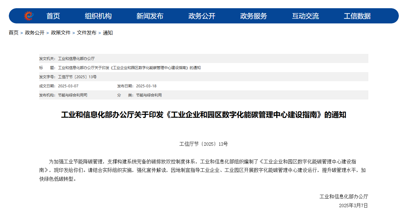工業和信息化部于2025年3月正式印發《工業企業和園區數字化能碳管理中心建設指南》(工信廳節〔2025〕13號),為能碳管理系統的建設提供了國家標準指導。