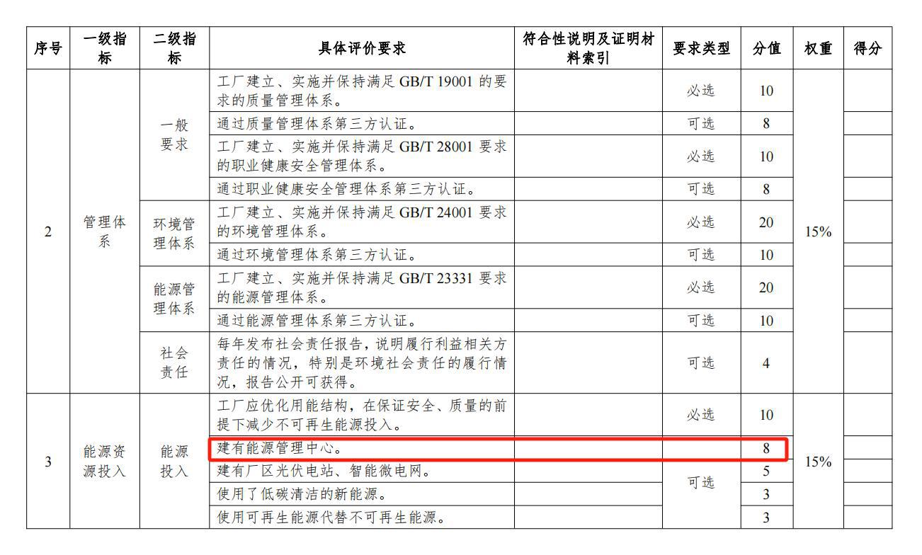 綠色工廠:根據(jù)工業(yè)和信息化部2024年1月19日關(guān)于印發(fā)工信部節(jié)〔2024〕13號《綠色工廠梯度培育及管理暫行辦法》的通知中第五章配套機(jī)制中第二十二條、第二十三條、對綠色工廠企業(yè)提供規(guī)劃布局、技術(shù)改造、專項資金申請、政府采購、試點(diǎn)示范、金融服務(wù)、品牌宣傳等方面的支持。同時,附表1.1.2綠色工廠評價指標(biāo)第三方評價表一級指標(biāo)中能源資源投入的二級指標(biāo)能源投入的具體評價要求中建有能源管理中心可以+8分。如下圖: