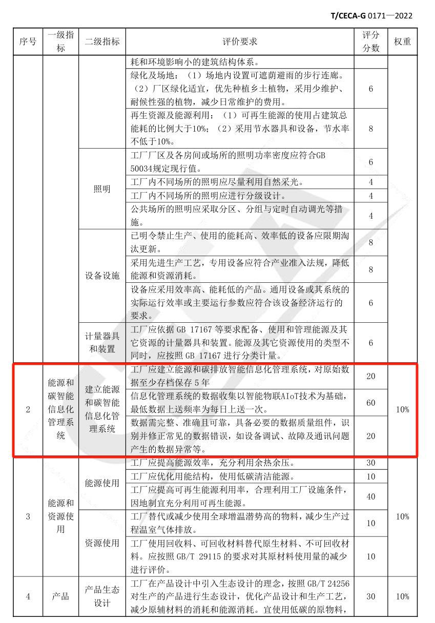 零碳工廠:中國節(jié)能協(xié)會發(fā)布的團(tuán)體標(biāo)準(zhǔn)《零碳工廠評價規(guī)范》中表B.2零碳工廠評價要求表中一級指標(biāo)中能源和碳智能化信息管理系統(tǒng)的二級指標(biāo)能源和碳智能化信息管理系統(tǒng)的具體評價要求中建有能源管理中心可以+100分,占比10%。