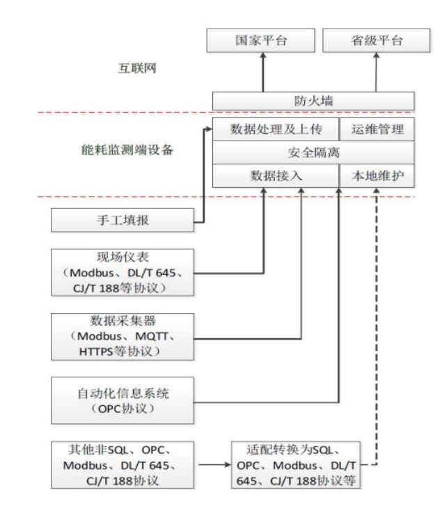①支持從現(xiàn)場的儀表獲取數(shù)據(jù):通過 Modbus(GB/T19582)、 DL/T645、CJ/T188 協(xié)議,從現(xiàn)場儀表采集需要的能耗實(shí)時(shí)數(shù)據(jù),并進(jìn)行匯總生成上報(bào)的能耗數(shù)據(jù);