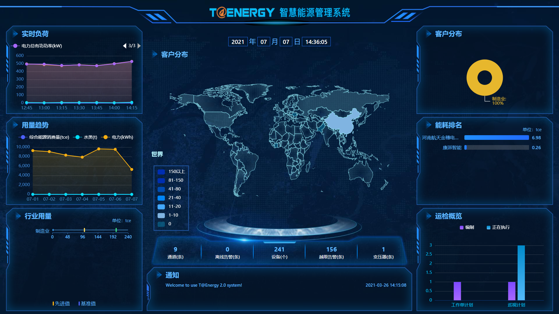 該功能包含對企業(yè)的用能分析、部門綜合能耗、設(shè)備用能分析、電量指標(biāo)綜合分析四個(gè)方面,全方位的幫助企業(yè)對水、電、氣、暖多種能源介質(zhì)進(jìn)行統(tǒng)計(jì)分析,對比企業(yè)能耗情況與同期能耗的差異化情況,了解各個(gè)部門的綜合能耗情況,細(xì)致分析耗能設(shè)備的負(fù)荷率與耗能情況;并對使用電費(fèi)的組成情況、電價(jià)時(shí)段、整體功率因數(shù)、設(shè)備負(fù)荷特性進(jìn)行分析與展現(xiàn)。T@Energy 智慧能源管理系統(tǒng)的能耗分析功能能夠幫助用戶快速找到能耗的異常與設(shè)備耗能異常,幫助其發(fā)現(xiàn)節(jié)能空間,為節(jié)能方案提供科學(xué)的數(shù)據(jù)支持。